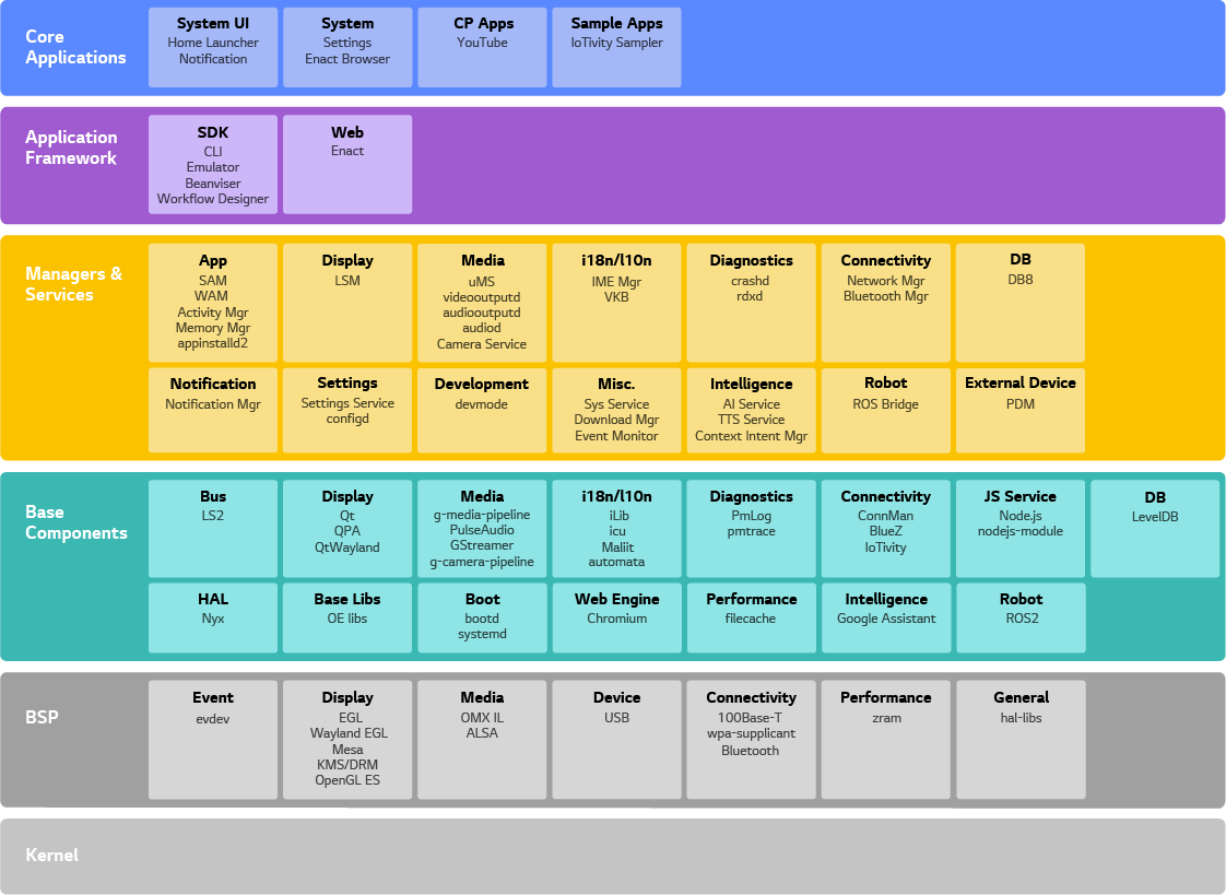 각 회사별로 사용하는 내용을 직접 언급하는 것은 문제가 있어 오픈소스 AGL (Automotive Grade Linux), webOS OSE (Open Source Edition) 등을 가지고 간단히 언급하고자 한다.