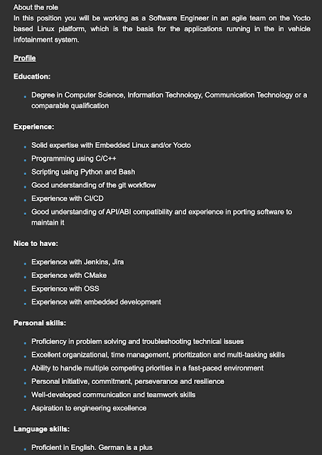 팀에서 Yocto Expert 2 명을 채용하고 PO 1명을 채용하는데 서류부터 기술 인터뷰까지 관여를 하면서 느낀점을 간단히 적어보고자 한다. 채용 Position은 "Embedded Linux Engineer with Yocto expertise (all genders) - in Berlin" 이고 Job Description은 아래와 같다.