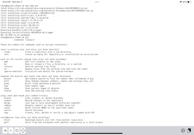 그런데 git clone 을 하는데 문제가 생겼다. Issue를 찾아보니 https://github.com/ish-app/ish/issues/943 에 이미 보고 되었고 아직 완벽하게 해결되지 않았다. Issue적힌 workaround로 동작을 해보니 느리지만 정상 동작했다.