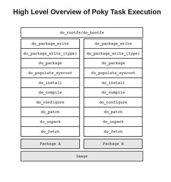 Yocto에서는 각 레시피에서 DEPENDS와 RDEPENDS 변수를 통해 빌드타임, 런타임 의존성을 정의한다. DEPENDS 변수에는 레시피 이름으로 빌드 타임 의존성을 설정하고, RDEPENDS 변수에는 패키지 이름으로 런타임 의존성을 정의한다. 레시피에 정의된 대로 각 컴포넌트는 Yocto 빌드 시 다음과 같은 순서로 task가 실행 된다.