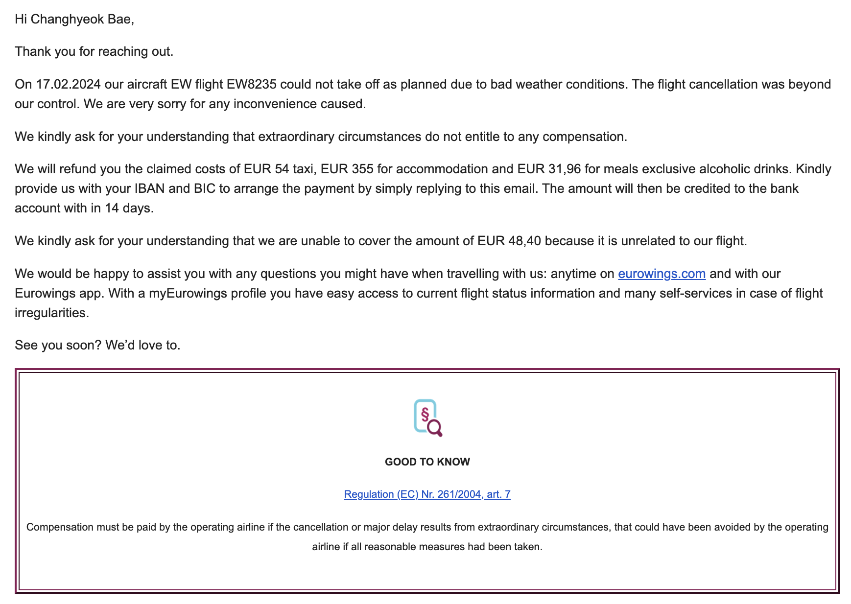 두변째 경우는 최근 핀란드 로바니에미 -> 베를린으로 돌아오는 유로윙스 (eurowings) 인데 공항에서 가서 기다리고 있는데 2시간정도 계속 지연된다고 나오더니 급기야 날씨로 인해 다음날로 연기되었다고 했다. 호텔을 알아서 구해도 되고 멀지만 직접 제공하는 호텔로 가도 된다고 해서 부랴부랴 이전에 묵었던 호텔에 전화해서 다행히 방을 잡았다. 이 때도 고객 서비스 이메일 (service@eurowings.com) 찾아 예약번호와 함께 호텔 비용, 왕복 택시비, 음식비, 보상까지 청구했는데 날씨 때문이여서 추가 보상은 안되고 호텔 비용, 왕복 택시비, 음식비까지만 되었고 이 경우는 일주일만에 450유로 정도되는 비용을 모두 환불 받았다.