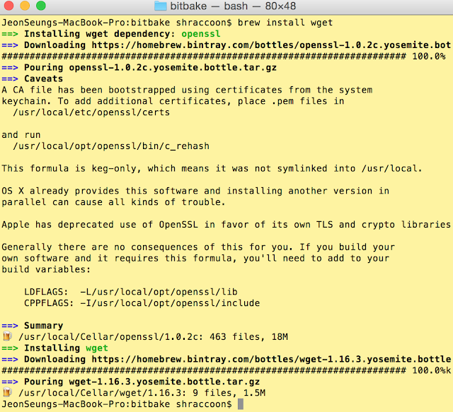 Ubuntu에 apt-get이라는 패키지 관리자가 있듯이 MAC의 OSX에는 brew가 있다. 본 글에서는 brew의 설치 방법과 사용법에 대해서 간단히 기술 하고자 한다. Homebrew이고 오픈소스로 https://github.com/Homebrew/homebrew 에서 관리되고 있다. 설치 방법 공식 페이지 Eng: http://brew.sh/ 한글: http://brew.sh/index_ko.html brew 설치 명령어 $ ruby -e "$(curl -fsSL https://raw.githubusercontent.com/Homebrew/install/master/install)" brew를 이용한 wget 설치 예제 $ brew install wget 아래는 필자의 macbook에서 wget을..