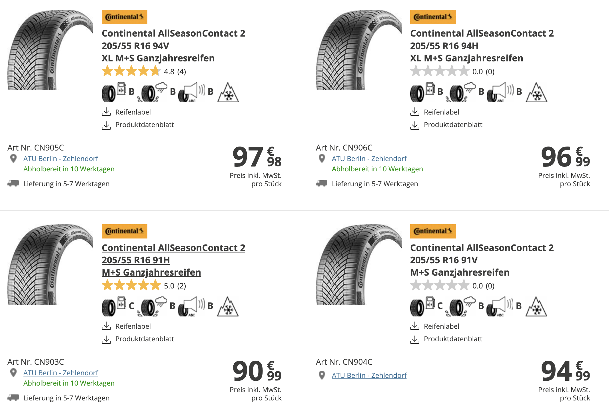 독일은 2024년 10월부터 법적으로 겨울에는 반드시 알파인 마크가 달려 있는 타이어를 가진 차만 운행할 수 있게 된다. 기존에는 M+S 마크가 붙거나 겨울용 타이어를 겨울에 허용을 했지만 이제는 반드시 알파인 마크가 타이어에 있어야 한다. 그렇지 않으면 벌점 및 벌금이 부과되고 사고가 나면 사고 처리에 상당히 불편해진다. 기존에 M+S 마크가 붙은 사계절 타이어를 달고 달렸으나 이제는 필요해서 조금 전에 Continental AllSeasonContact 2 94V XL M+S 타이어로 ATU에서 구매를 했다. Continental을 구매한 이유는 여기저기 사계절 타이어에 대해서 검색해서 비교해보고 필자한테 맞는 것 같아서 골랐다. ATU에 검색해보니 차에 맞는 4가지 종류의 타이어가 나왔고 94V,..