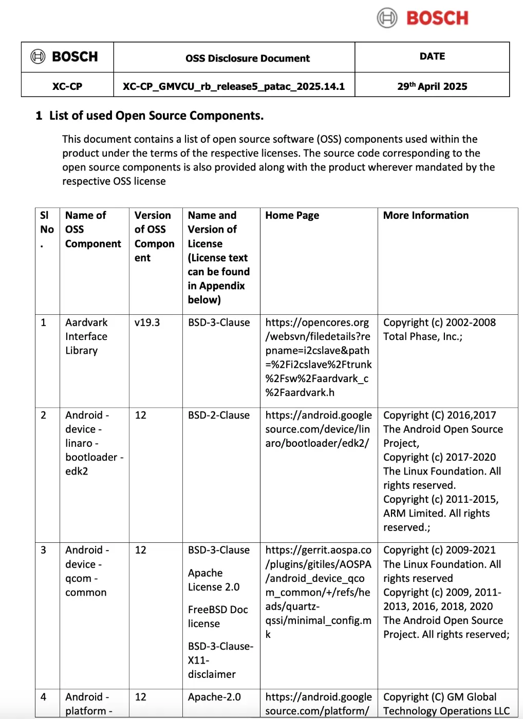 보쉬 (Bosch)에서 공고를 냈고 Android Automotive 를 OS로 사용하는 것을 알 수 있다. 이 외에도 추가적으로 dlt-daemon, hostapd, jack2 (audio), json-cpp, libfdt, kernel (5.4.254), protocal buffer, sqlite, synaptics touch driver, ublox GNSS HAL, yxml 과 같은 오픈소스를 사용하고 있다.