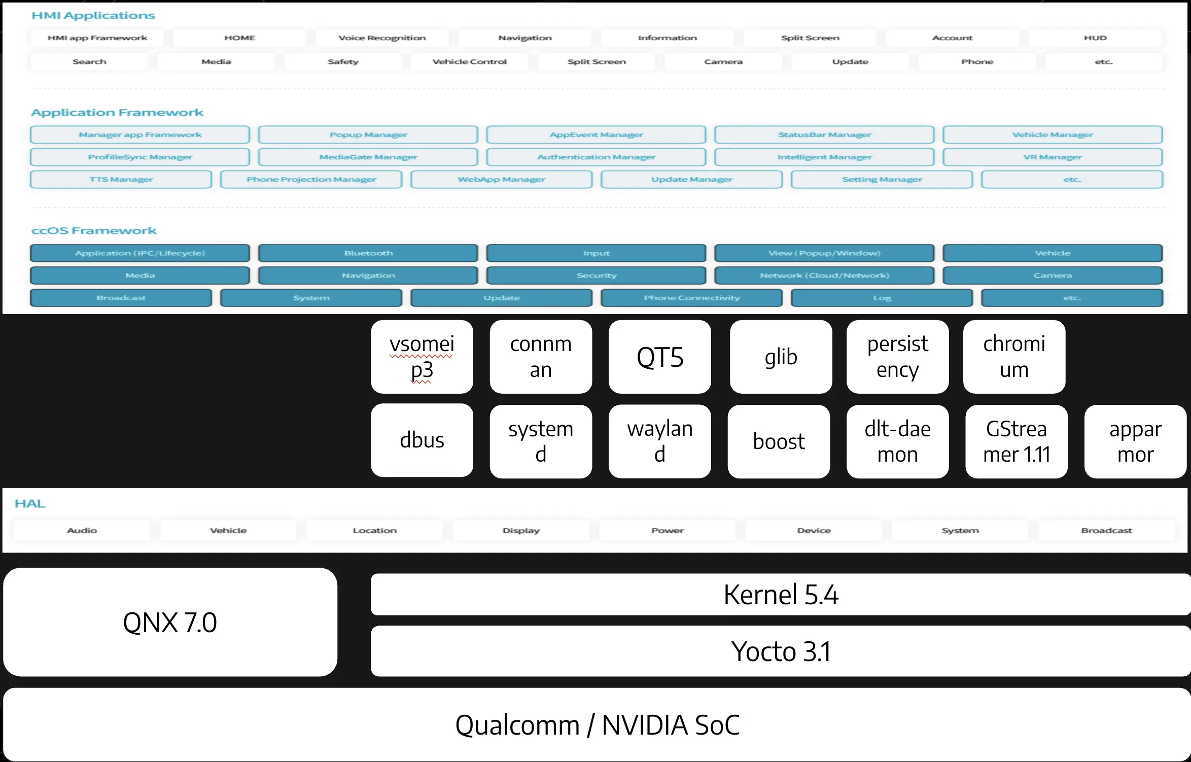 현대자동차 오픈소스 고지와 구글링을 한 아키텍처를 조합하여 간단하게 그려봤다. Qualcomm 또는 NVIDIA SoC를 사용하는 것처럼 보이고 QNX, Yocto Linux를 사용하고 있다. 그 외에도 리눅스에서 많이 사용하는 라이브러리, 자동차 소프트웨어에서 많이 사용하는 dlt-daemon, vsomeip3와 같은 컴포넌트들도 보였다.