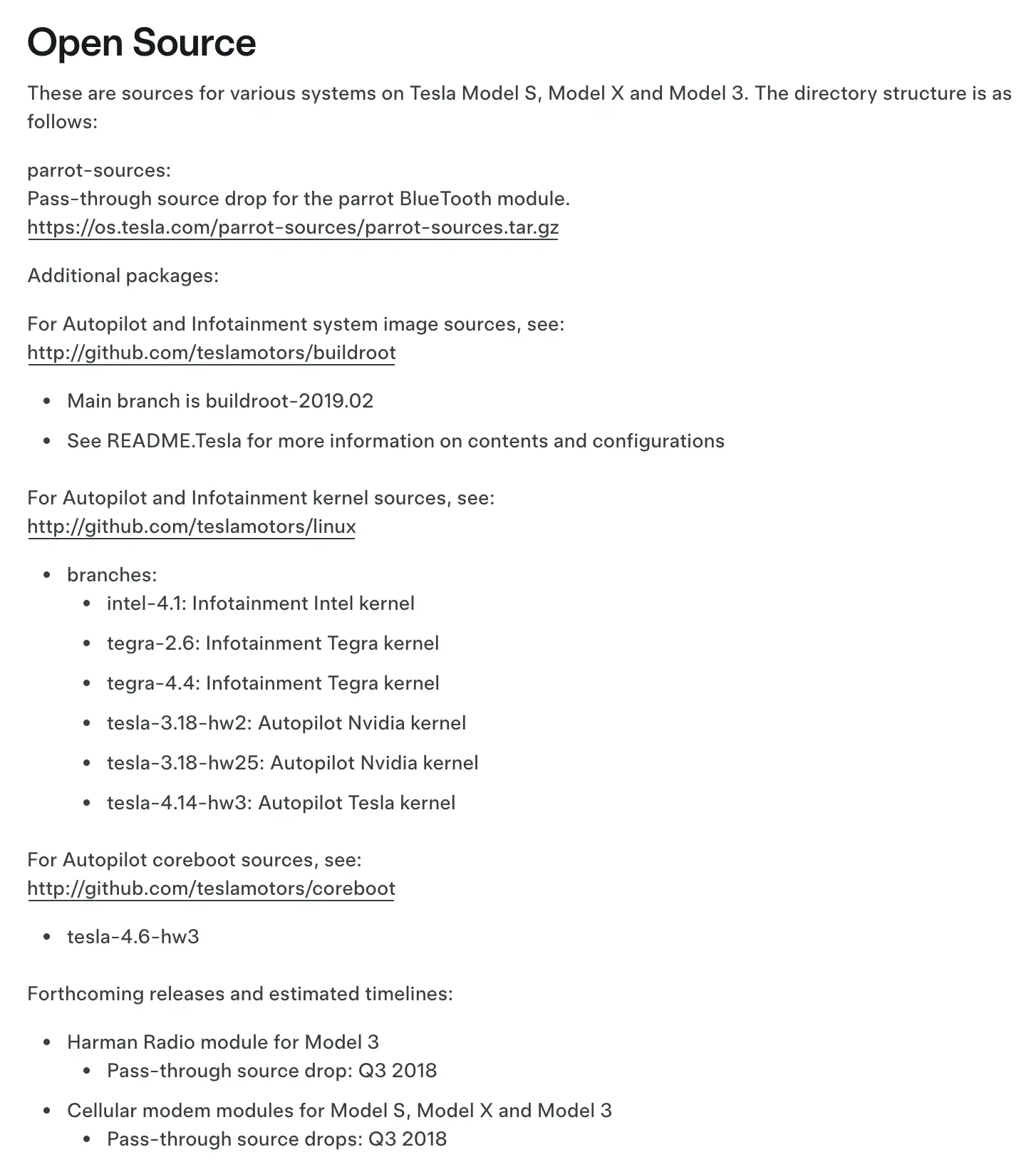 테슬라는 여기에서 볼 수 있듯이 오픈소스 고지가 간단하다. buildroot (2019년 2월 버전)라는 빌드 프레임워크에 수정사항들을 커밋 하나로 github에 다 올려놓았다. 적당히 살펴보면 리눅스 기반으로 인포테인먼트는 NVIDIA -> Intel -> AMD SoC 를 세대별로 사용한 것으로 보이고 FSD (자율주행)은 Tesla에서 직접 개발한 SoC를 사용하고 있는 것으로 보인다.