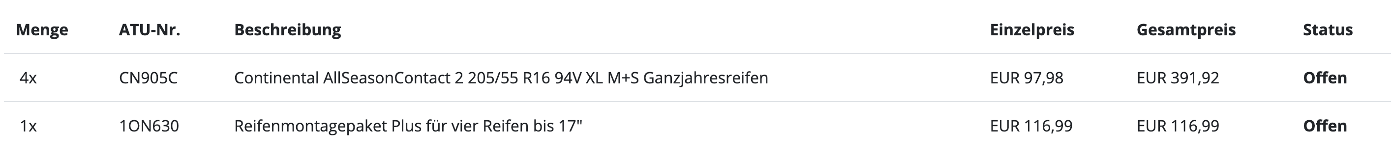솔직히 필자의 차에는 91H로도 충분했지만 94V로 구매했고 그중 하나가 개당 7유로의 크지 않은 가격차이에 비해 연료 효율이 B등급이라서 좋은 것으로 구매했다. ATU에서 구매를 했고 여기서 전체 바퀴 바꾸는 서비스를 추가 금액 (116.99 유로)를 내고 약속을 잡았다.