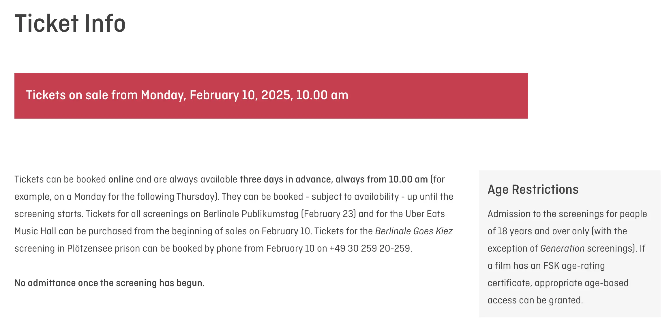 티켓은 영화 상영날짜 3일전 오전 10시 (CEST)부터 베를린 국제 영화제 홈페이지의 각 프로그램에 예매 링크가 열려있어 예매가 가능하다. 예를 들어 2월 15일 토요일에 상영하는 미키17을 예매하고 싶으면 3일전인 2월 12일 수요일 오전 10부터 예매가 가능하다. 미키17은 https://www.berlinale.de/en/2025/programme/202518039.html 에 예매 링크가 걸릴 것으로 예상되며 실제로 Eventim 홈페이지에서 예약할 수 있도록 자동으로 링크가 넘어간다.