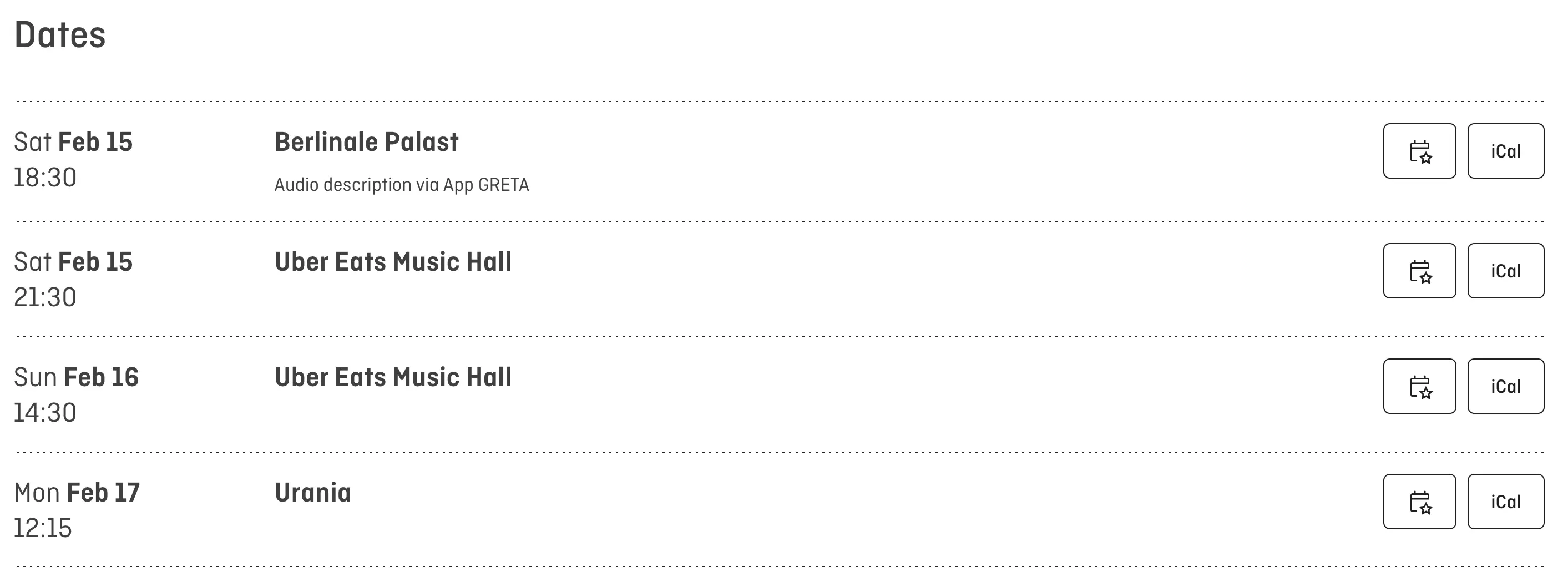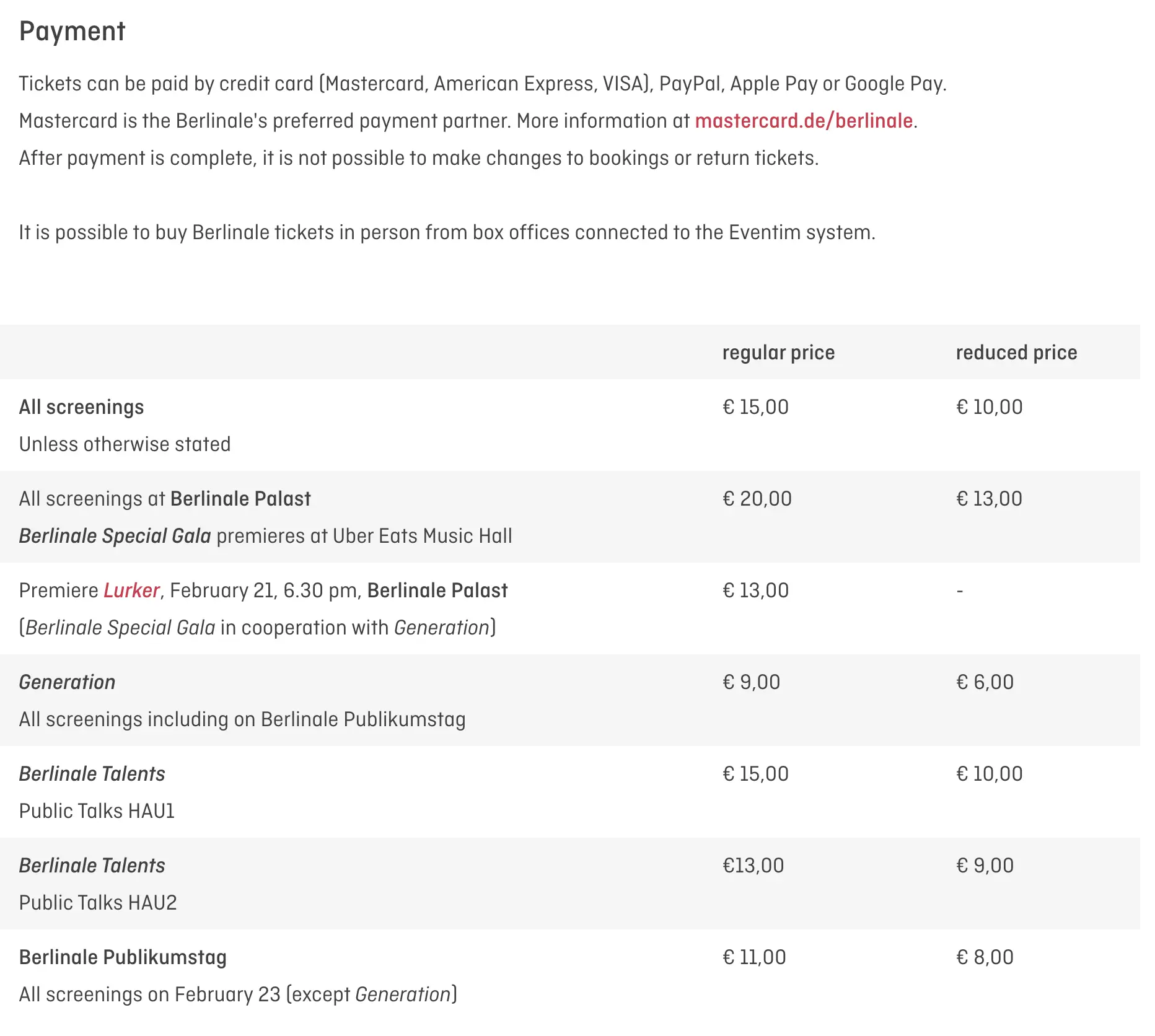 티켓 가격은 대부분 15유로인데 Berlinale Palast와 Uber Eats Music Hall에서 Special Gala가 있으면 20유로이다. 이 이야기는 이곳에서 배우들 무대 인사를 하는 곳이다라고 생각하면 된다.