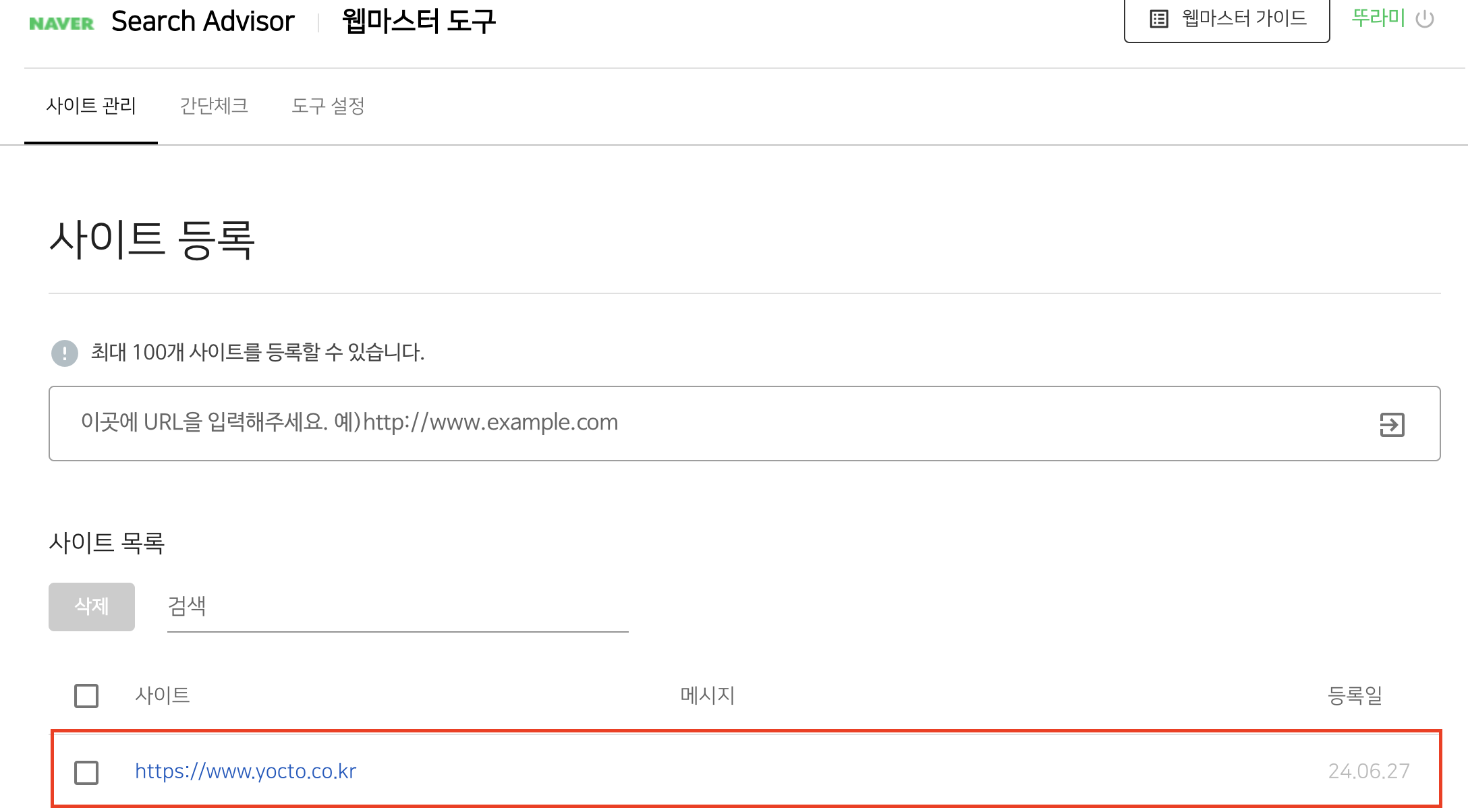 8. 최종적으로 아래 메시지가 나오고 사이트가 정상적으로 등록된 것을 알 수 있다.