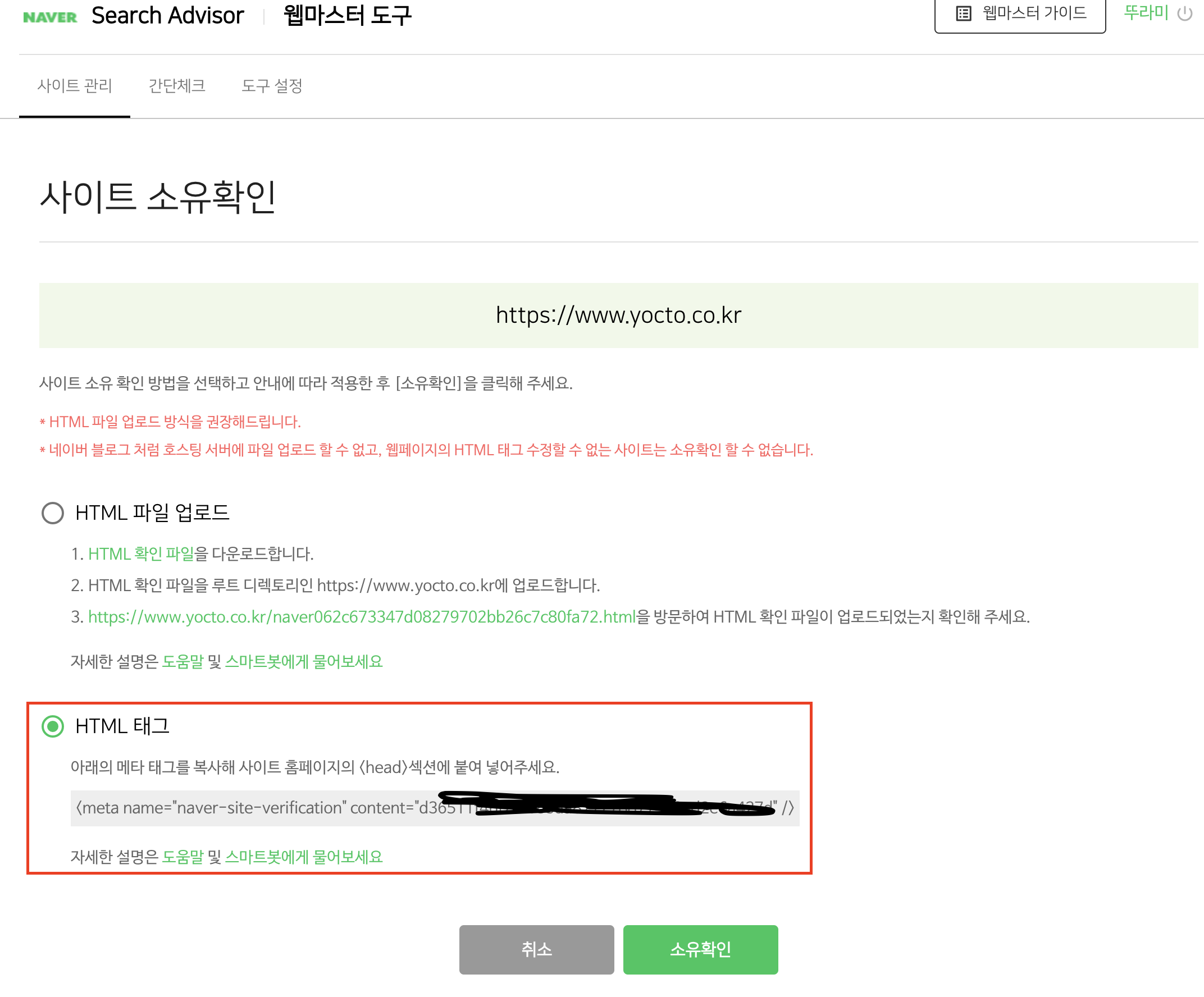 3. HTML 태그를 선택하고 아래 메타 태그를 복사한다. (소유확인 버튼은 아직 누르지 않는다.)