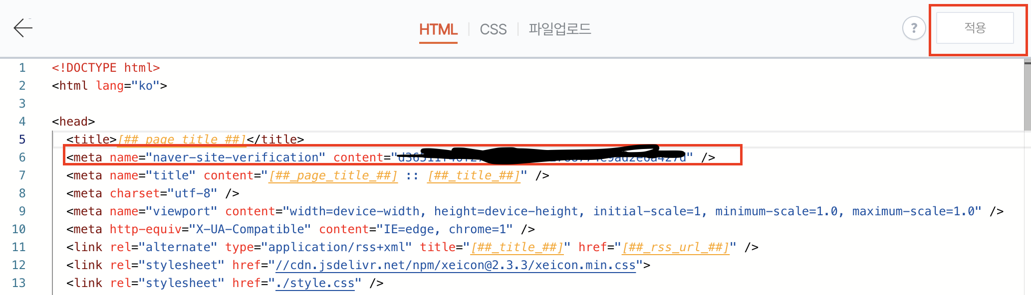 6. <title> 밑에 위에서 복사한 <meta> tag를 붙여넣고 적용버튼을 클릭한다.