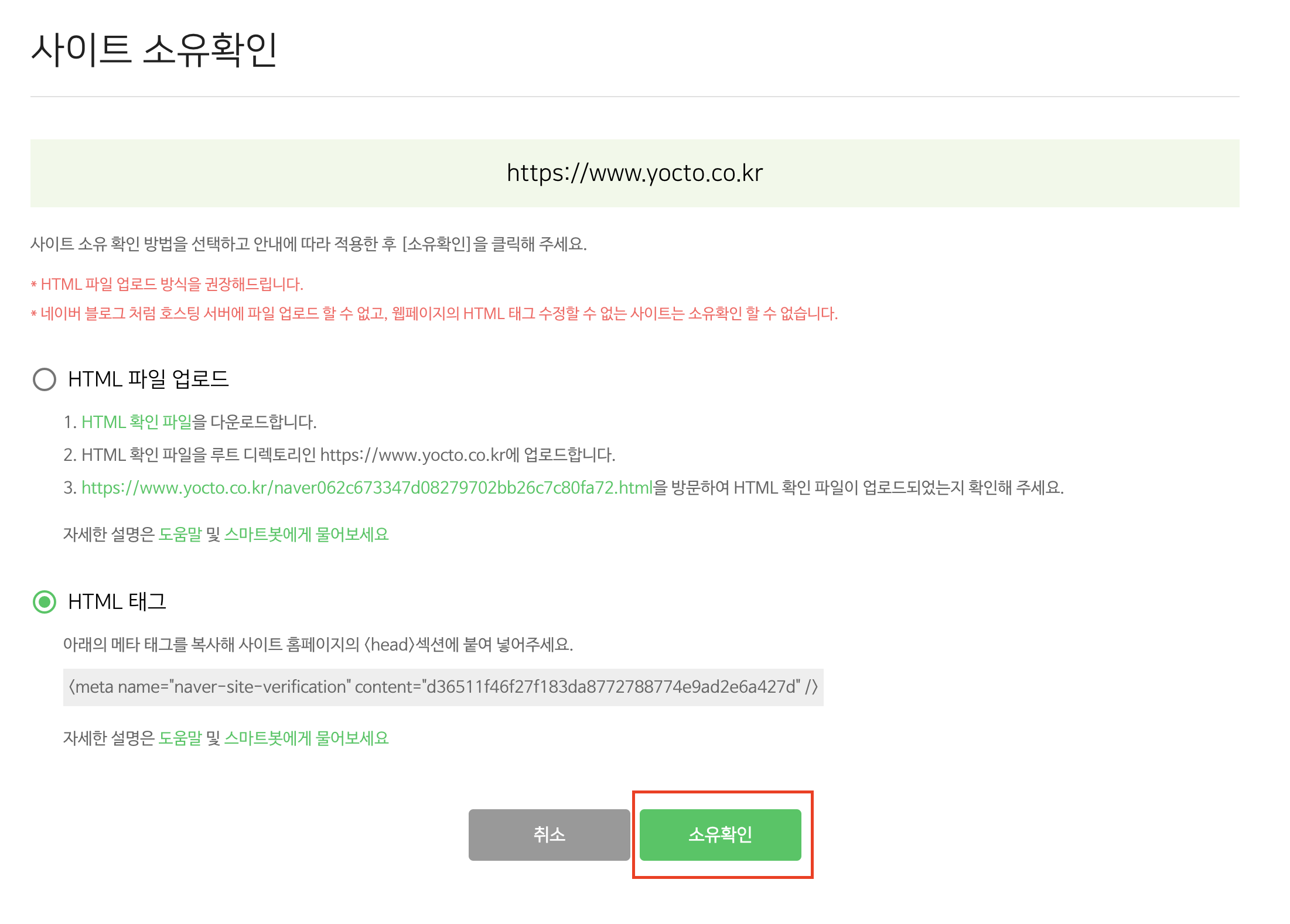 7. 다시 네이버 서츠어드바이저 페이지로 들어와서 소유확인 버튼을 클릭한다.