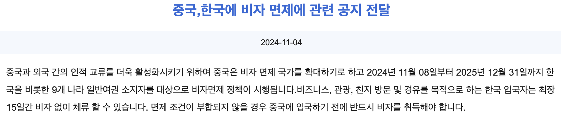 2024년 11월 8일부터 2025년 12월 31일까지 한국 여권을 가진 내국인은 최장 15일까지 무비자로 중국에 머물 수 있게 되었다. 중국 비자 공식 사이트인 https://bio.visaforchina.cn/SEL5_KO/tongzhigonggao/313113268044566528.html 를 보면 공지되어 있다.