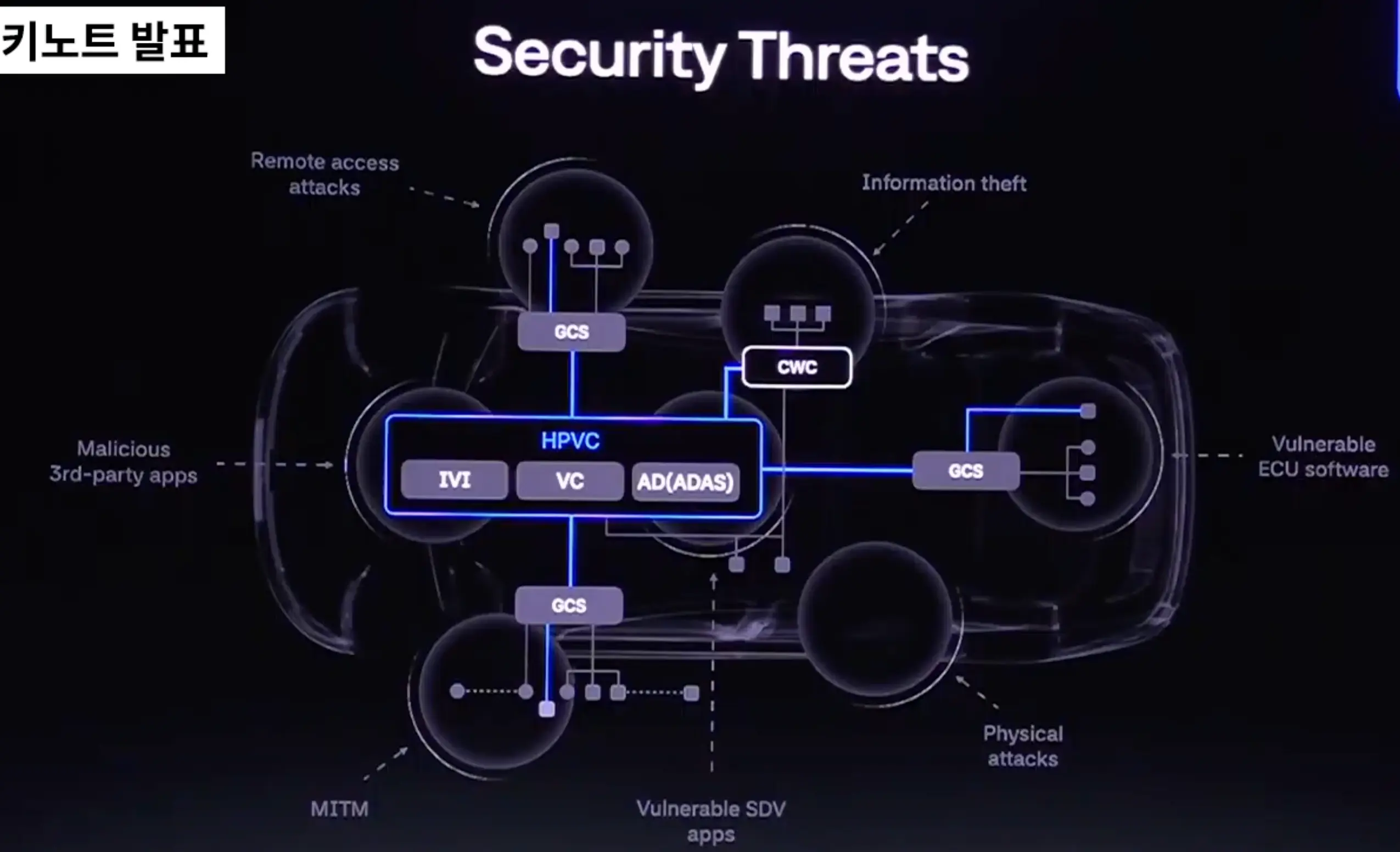 현대자동차 및 많은 OEM에서 추구하는 Zonal 아키텍처로 가는 방향을 보여주고 있다. 전원은 48V 시스템을 사용하고 Zonal 컨트롤러는 ASIL-B/D를 지원한다. HPVC (High-Performance Vehicle Computer)은 ASIL-B를 지원하고 이곳에 IVI, ADAS 등을 처리한다.