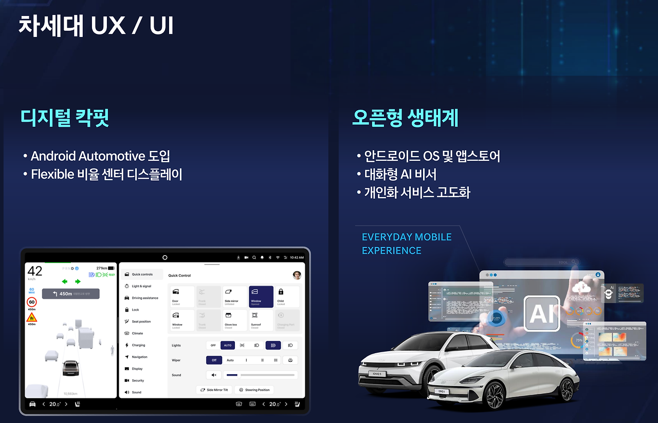 - 운전 중 주의 분산을 최소화하기 위해 UI가 간결하게 설계되었으며, 음성 명령 및 핸들 조작으로 대부분의 기능을 제어할 수 있다.