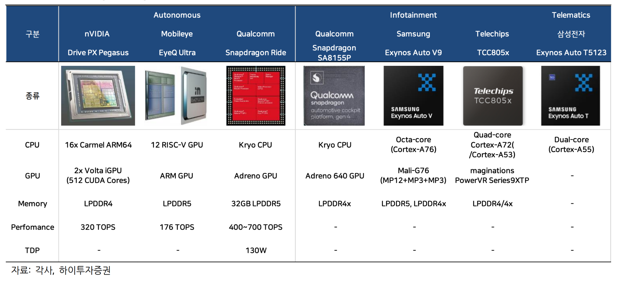 하이투자증권에서 정리한 자료이고 100%로 필자가 아는 것과 일치하지는 않지만 공개된 자료를 사용해야하기 때문에 위의 업체가 고성능 SoC를 제조하고 있다. 물론 추가적으로 다른 업체들도 대응을 하고 있다. 자동차 SoC는 위에서 이야기한 것처럼 내구성과 신뢰성이 정말 중요하기 때문에 모 회사의 Storage 연구원의 이야기에 따르면 최신 제품의 한세대 이전 제품을 Automotive에 적용한다고 한다. 하지만 고성능 SoC 쪽에서는 최신의 성능이 필요하기 때문에 최신 SoC Line up을 따라가는 경향이 많은 것 같다. 경우에 따라서 SoC 성능이 안맞는 경우 Apple Silicon의 MAX 시리즈 처럼 여러개의 SoC를 연결하여 하나처럼 사용할 수 있게도 하는 경우가 있는 것 같다.