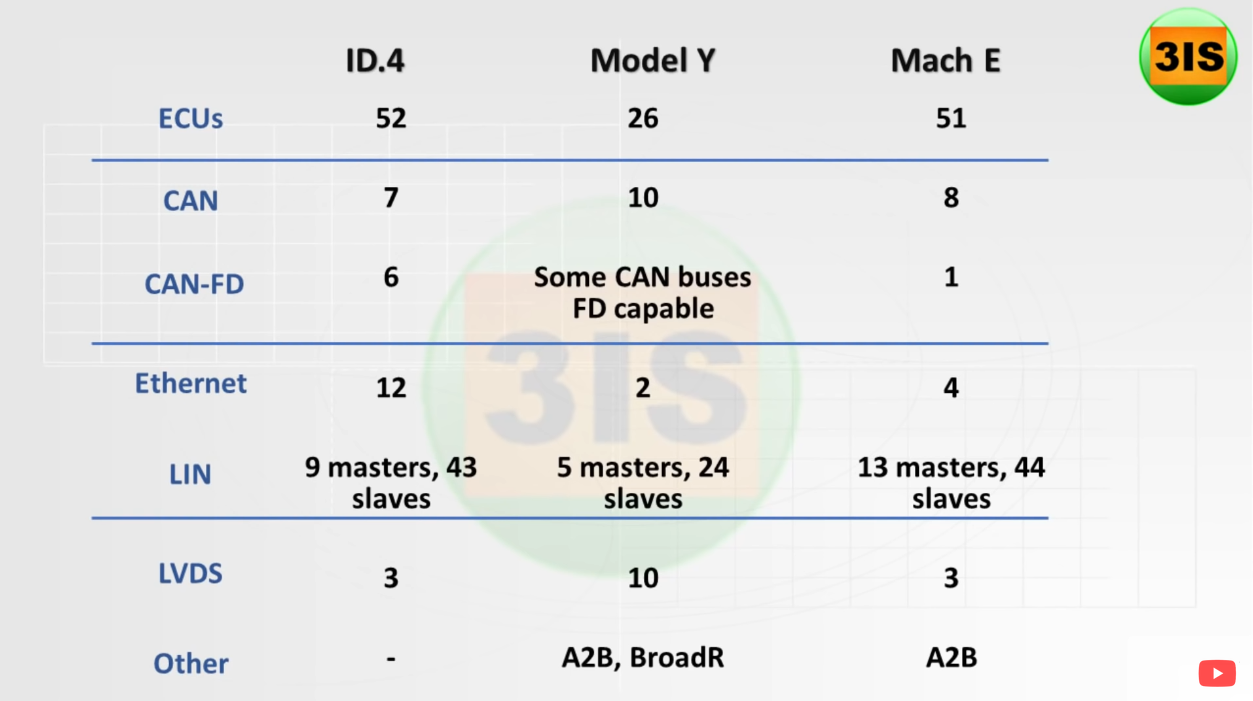 2021년도 기사에서 나온 자료인데 Tesla Model Y는 ECU가 26개로 나와 있다. 이중에 고성능 ECU는 Autopilot와 Infotainment ECU 이고 이제는 테슬라에서 설계한 SoC (최소한 Autopilot에서)를 사용한다고 알고 있다.