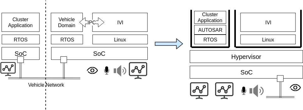 그 예로 기존에 각각 다른 SoC를 사용하던 Cluster와 IVI가 통합되어 Hypervisor를 사용하여 하나로 가려고 하고 있다.