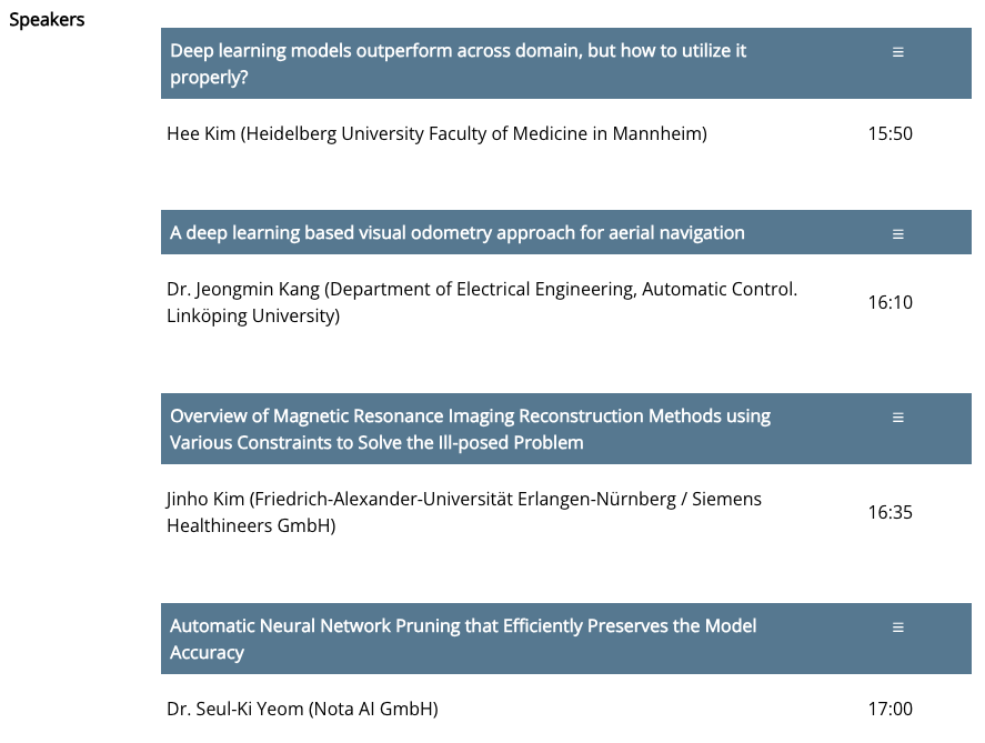 이번에 여러분야의 많은 과학자/기술자 분들을 알게 되었다. DLR(German Aerospace Center)에서 로봇을 연구하는 박사님, 네델란드에서 산업공학을 가르치는 교수님, 머신러닝으로 회사에서 연구하는 박사님, ETRI에서 연구하는 박사님들, 연구를 하셨다가 회사에서 주재원으로 나와 독일에 계신 박사님 (신기하게도 친구 아는분), TUM (Technical University Munich) 교수님과 학생분들, 회사의 채용 팀장님들, 반갑게도 GIST 학생처장님과 담당자분들까지 많은 분들을 만나고 알게 되었고 새로운 시각에서 지금 하는일들을 바라보게 되어 정말 좋은 기회였고 가능하면 매년 참석할 예정이다.