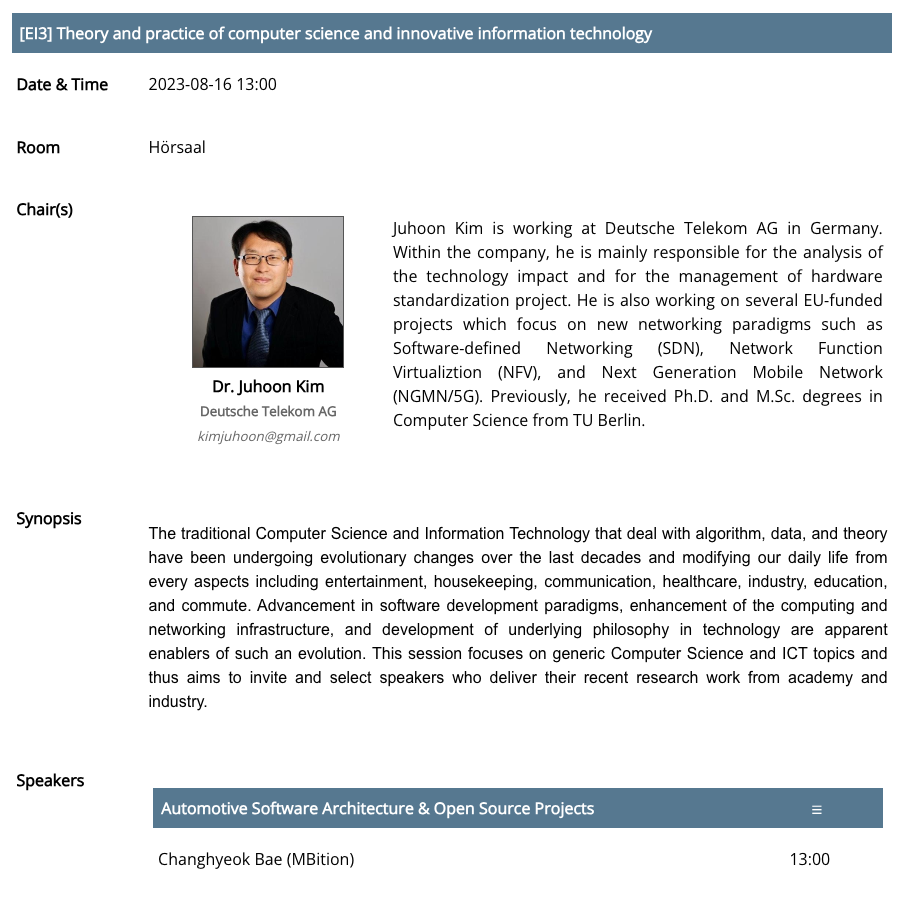 재외과협의 현황은 https://www.kofst.or.kr/general.bit?sys_type=0000&menu_code=020300 에서 볼 수 있으며 필자는 재독한국과학기술자협회 소속으로 작년에 이어 올해도 참여하여 차량용 소프트웨어 주제로 발표를 하였다.
