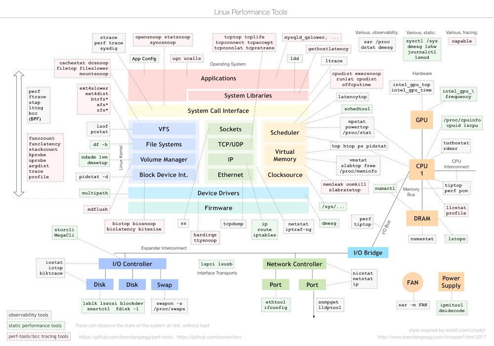 This page links to various Linux performance material I've created, including the tools maps on the right. The first is a hi-res version combining observability, static performance tuning, and perf-tools/bcc (see discussion). The remainder were designed for use in slide decks and have larger fonts and arrows, and show: Linux observability tools, Linux benchmarking tools, Linux tuning tools, and Linux sar. For even more diagrams, see my slide decks below.