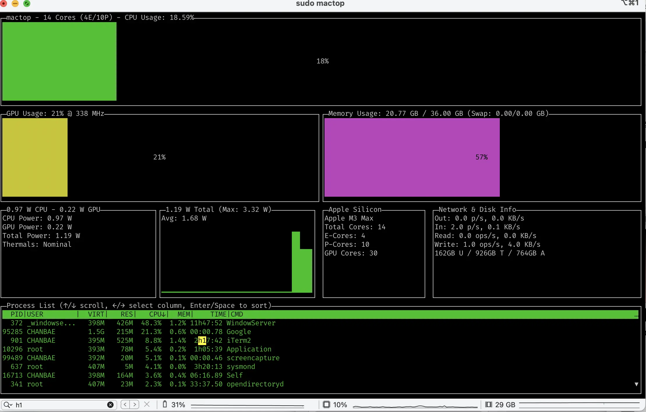 개인적으로는 htop을 모니터링할 때 편하게 많이 사용하는 편이고 GPU 사용량을 보기 위해 경우에 따라서는 mactop도 가끔 사용한다. Activity Monitor도 UI가 잘되어 있어서 좋지만 거의 사용하지는 않는다.