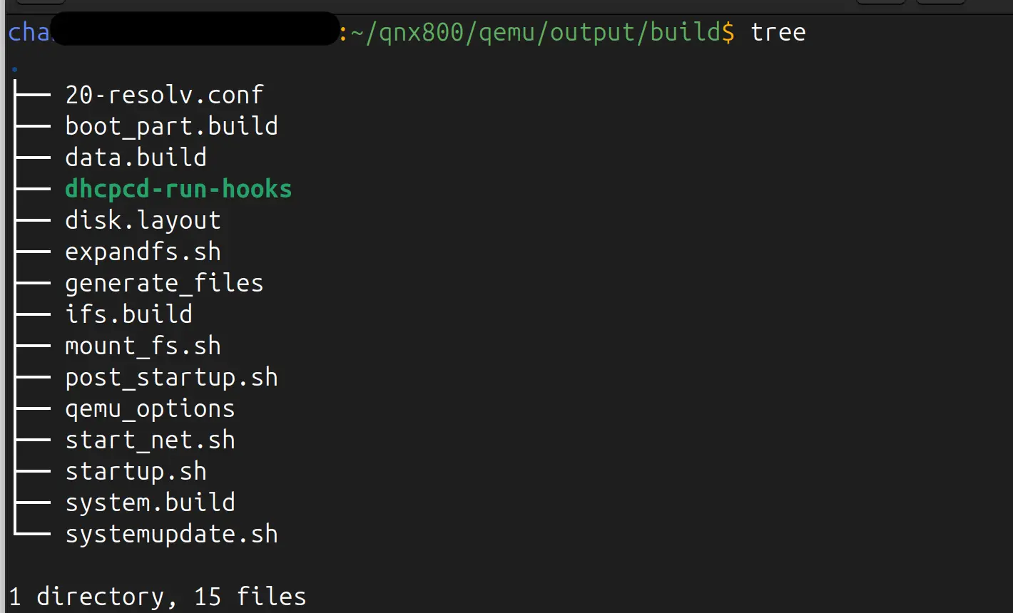 output/build 디렉토리를 보여주고 실제 QEMU 이미지 파일을 생성하는데 필요한 build 파일 및 sh 파일이 있다. 필요에 따라서 이 파일들을 수정한 후 --build 옵션으로 빌드를 하면 수정사항이 반영이 되어 이미지가 생성된다.