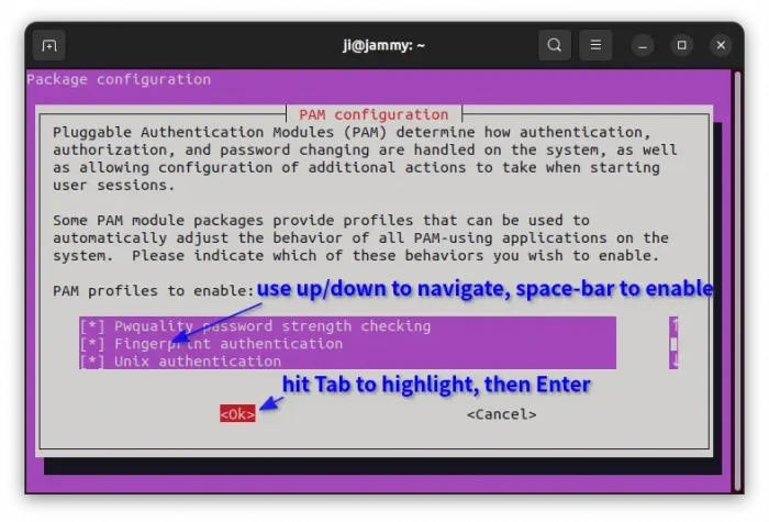 4. 다음 명령어로 인증 서비스 화면이 나오면 "Fingerprint authentication"을 선택한 후 저장하고 나온다.