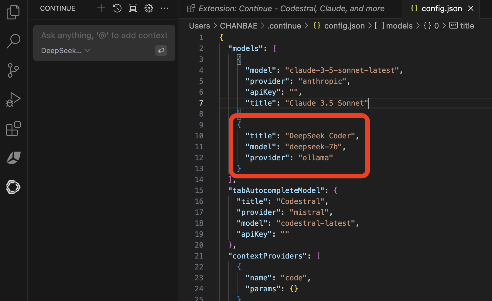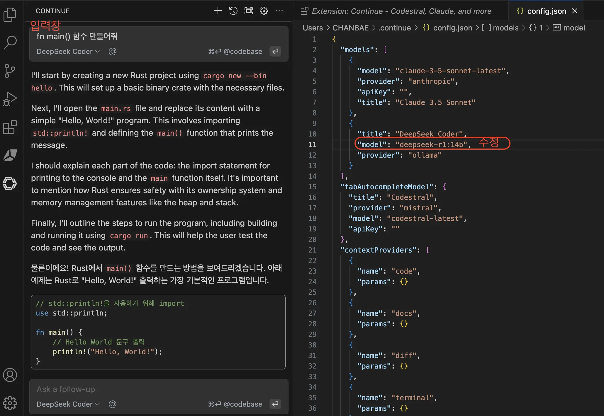 주의) 터미널에서 "ollama serve" 명령어를 미리 실행시켜 놓아야 한다. 또한 "ollama list" 명령어를 통해 현재 내 PC에 설치되어 있는 모델의 이름을 확인하고 아래 그림에 빨간 박스 내에 있는 model 이름과 일치하는지 확인한다. 그렇지 않으면 model이 없다고 실제 실행할 때 에러가 난다. 기본은 deepseek-7b으로 되어 있지만 그 모델과 PC에 설치된 모델 이름이 달라서 deepseek-r1:14b로 변경하고 저장했다.