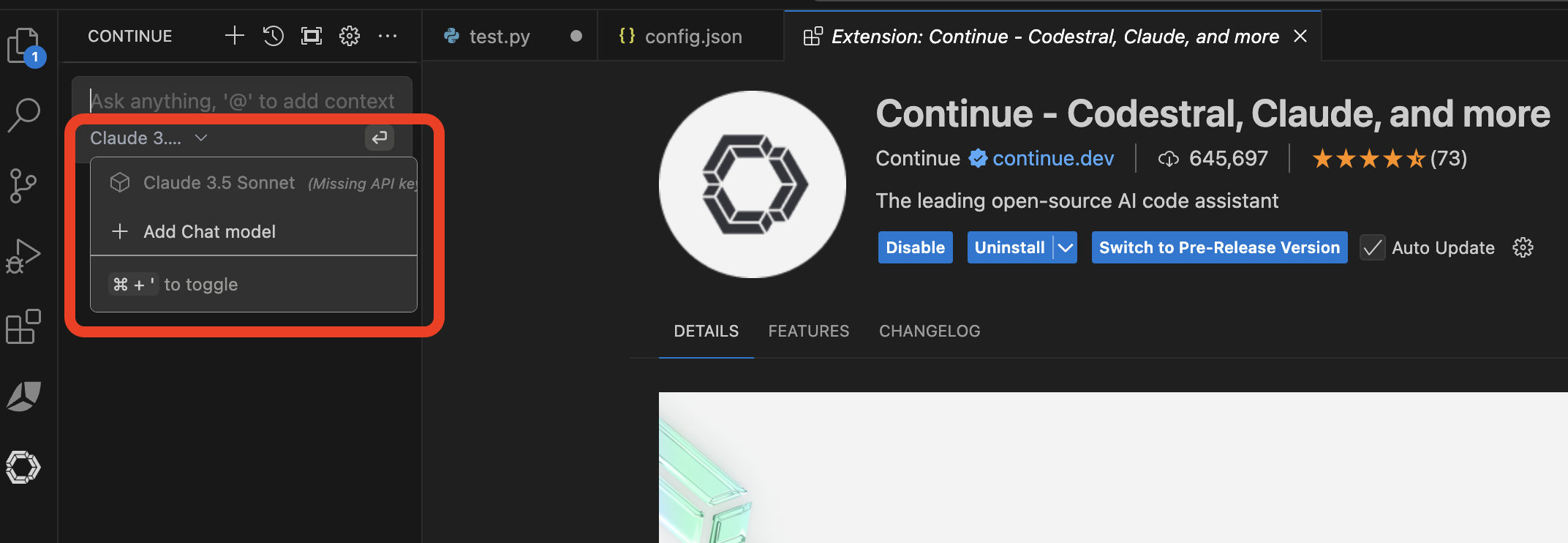 Continue 창에서 Claude 3... 옆에 있는 ᐯ 를 클릭하여 Add Chat model 을 선택한다.