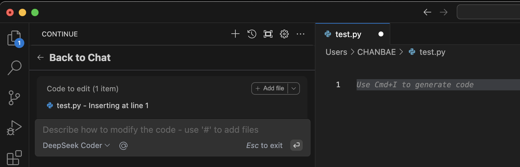 왼쪽 창이 CONTINUE Extension이고 오른쪽 창이 test.py 이름을 가진 코드를 작성할 수 있는 창이다. 처음부터 설명하기 위해 코드가 없는 빈 파일을 보여주었다. 코드 창에 "Use Cmd+I to generate code" 라고 가이드가 있듯이 CMD와 I키를 동시에 누르면 커서가 왼쪽 창으로 이동하면서 만들 코드를 설명할 수 있도록 해준다.