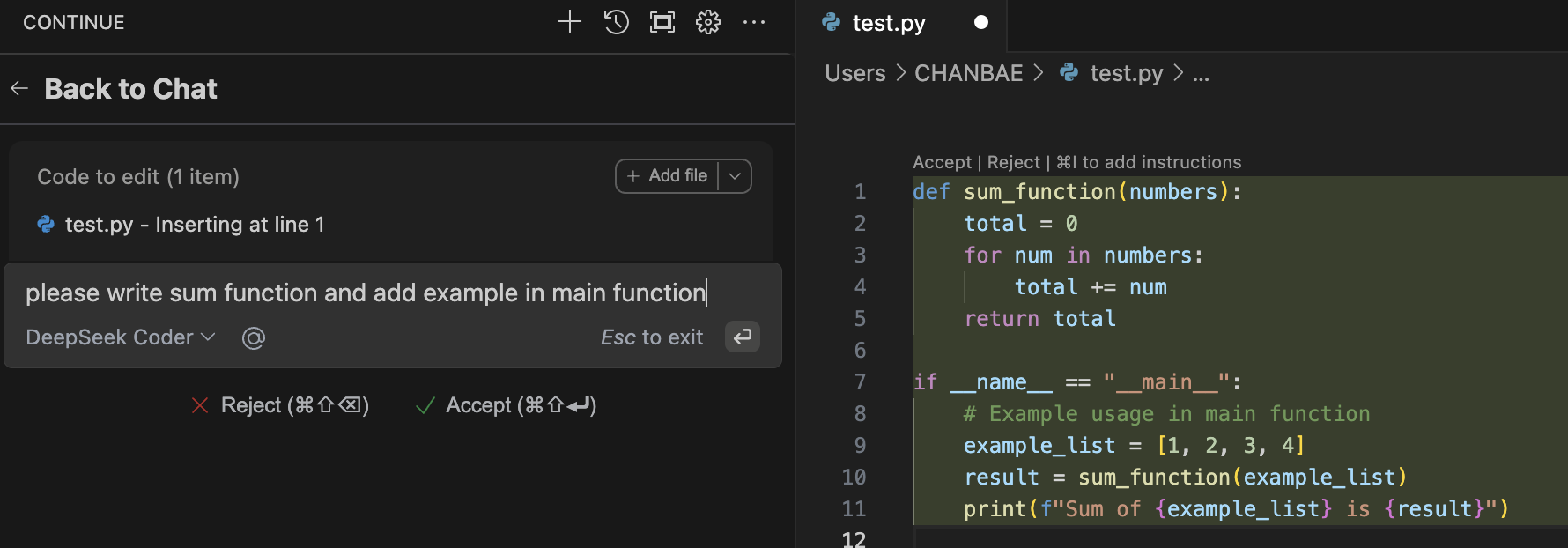 왼쪽 창에서 "please write sum function and add example in main function" 라고 치면 실제 코드 창에 코드를 만들어주고 왼쪽 창 밑이나 실제 작성된 코드 위에 거절할 것인지 수락해서 코드를 반영시킬 것인지 물어본다. Reject하면 생성된 코드가 지워지고, Accpet하면 생성된다.
