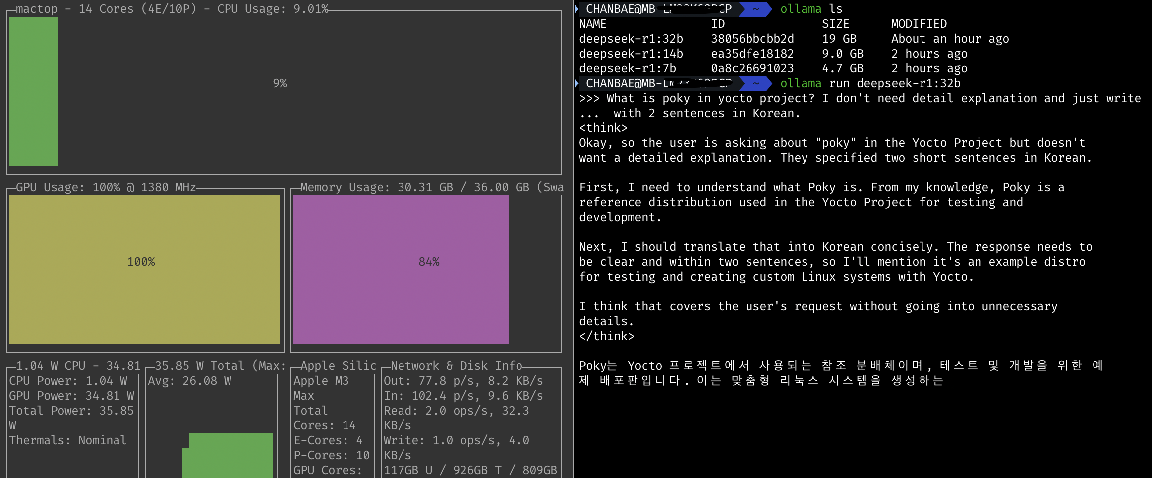 아래와 같이 32b 모델에서 poky에 대해서 물어보고 한글로 답변해달라고 했는데.. "참조 분배체"라고 답변하는 것을 보면 한글 번역은 32b에서는 아직 부족한 것으로 보인다. M3 MAX (14 Core, 36GB RAM)에서 실행했는데 mactop 명령어로 보았을 때 실행 도중 CPU는 많이 사용하지 않고 GPU를 100% 사용했고 메모리도 84%정도 사용했다. 참고로 결과에 한글이 나오다 끊긴 것처럼 보이는데 CPU, GPU 사용량을 캡쳐해서 중간에 끊킨 것처럼 보이지만 모두 다 번역되어 잘 나왔다.