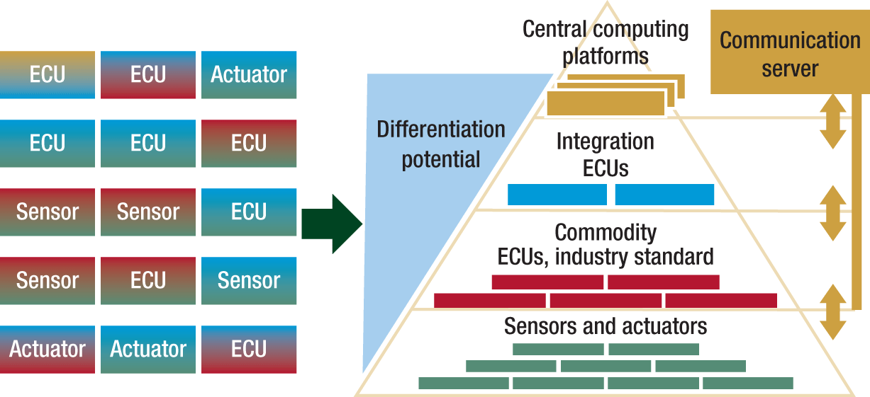 과거에는 각 센서단위로 저사양의 ECU(Electronic Control Unit)를 Classic Autosar 같은 소프트웨어의 configuration으로 구성했다면, 앞으로는 아래 그림처럼 ECU가 고성능의 ECU로 통합되고 Adaptive Autosar을 포함한 각 OEM이나 Tier-1에서 통합한 소프트웨어를 제공한다.