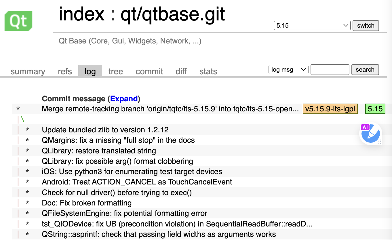 QT는 Commercial과 LGPL Dual License를 모두 지원한다. Commercial 버전과 LGPL 버전의 코드는 거의 동일하지만 commit이 정확히 일치하지는 않는다. 오픈소스의 qt 저장소 커밋을 보면 한꺼번에 Commercial 저장소 commit들을 merge한 merge commit 들이 보인다.