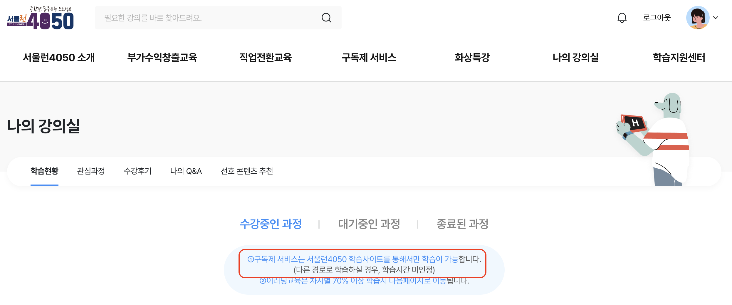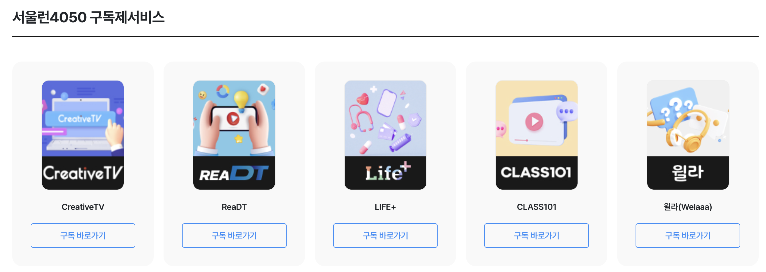 https://seoullearn4050.cylearn.co.kr/user/v2/Main.do 링크로 들어가면 아래와 같이 각 구독제 서비스의 구독 바로가기에 들어가서 구독을 신청할 수 있다.