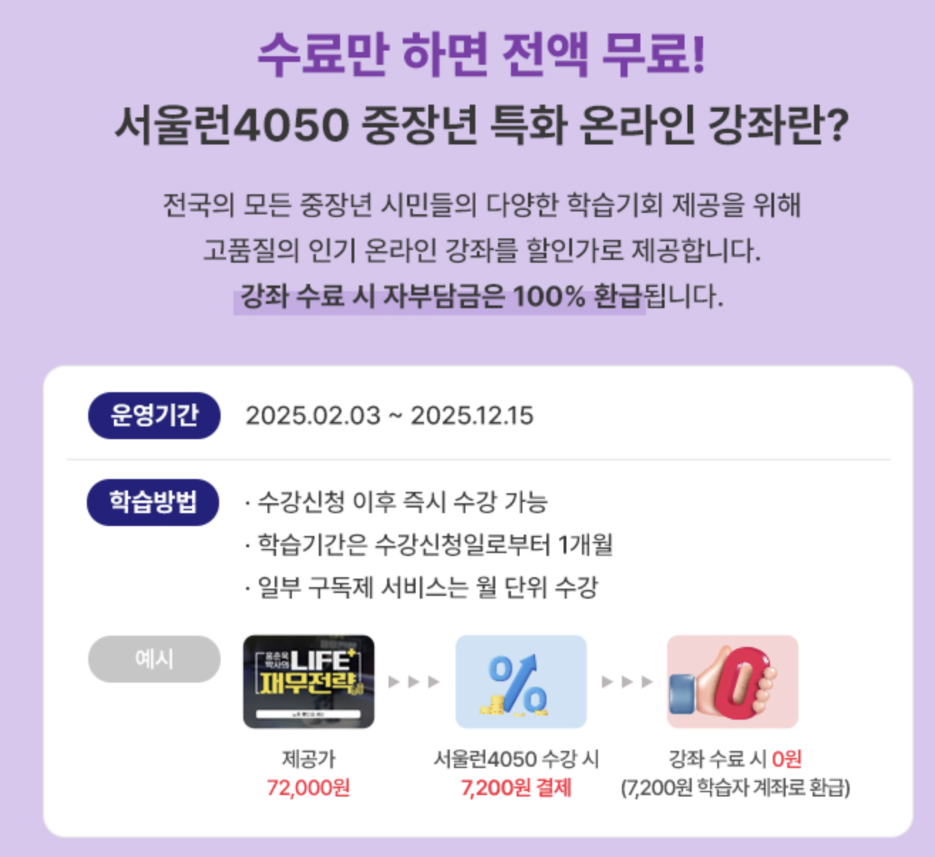 서울시에서 서울런4050이라는 평생학습 프로그램을 운영하고 올해 2025년은 2월 3일 부터 12월 15일까지 서울시민뿐만이 아닌 전국민을 대상으로 운영한다.