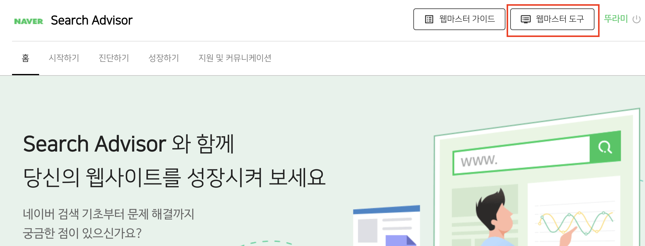 1. 우선 네이버 서치어드바이저 (https://searchadvisor.naver.com/) 홈페이지가 가서 로그인을 한 후 웹마스터 도구에 들어간다.
