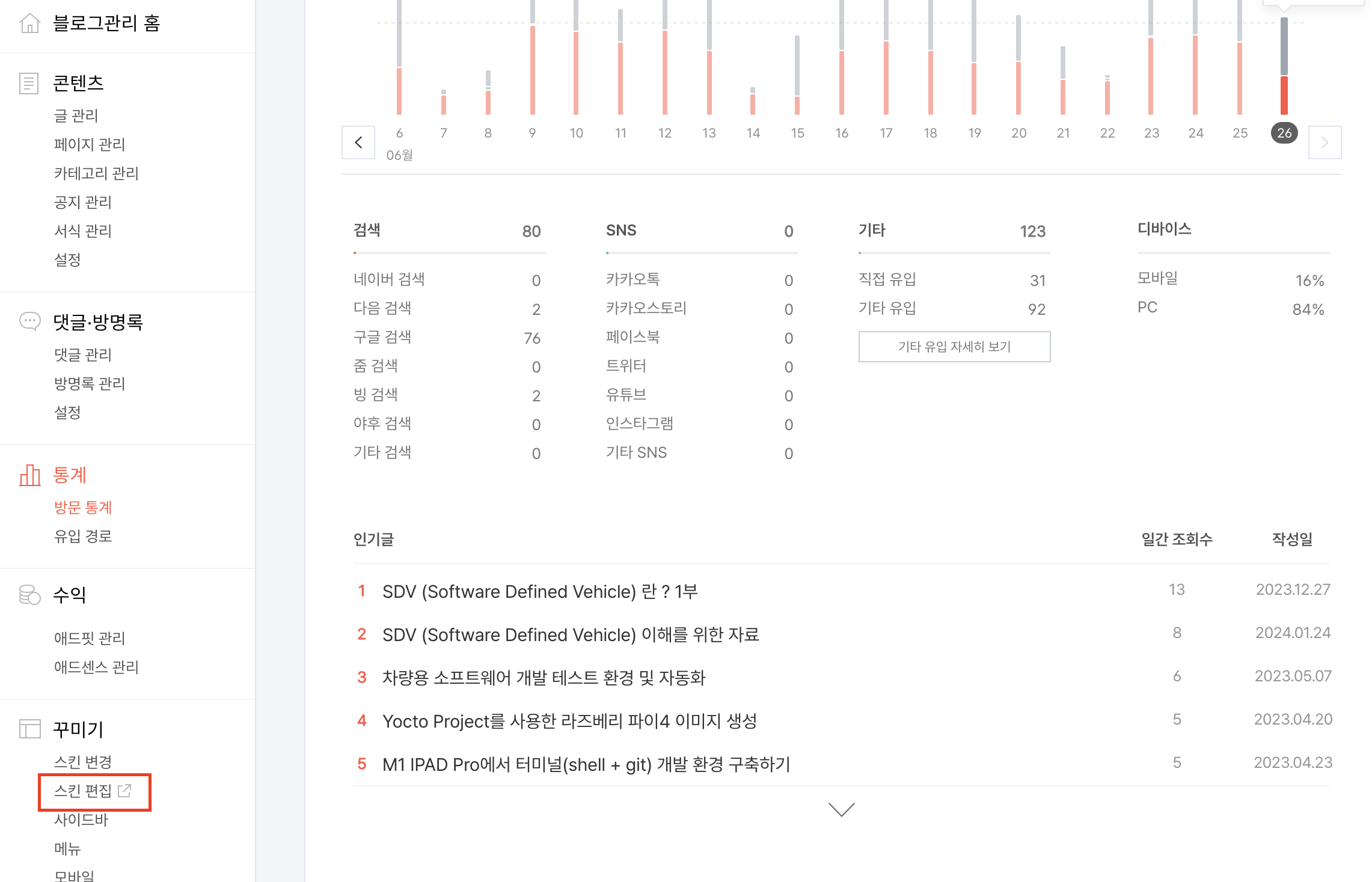 4. 티스토리 블로그 관리자 페이지에 들어가서 꾸미기 -> 스킨 편집에 들어간다.