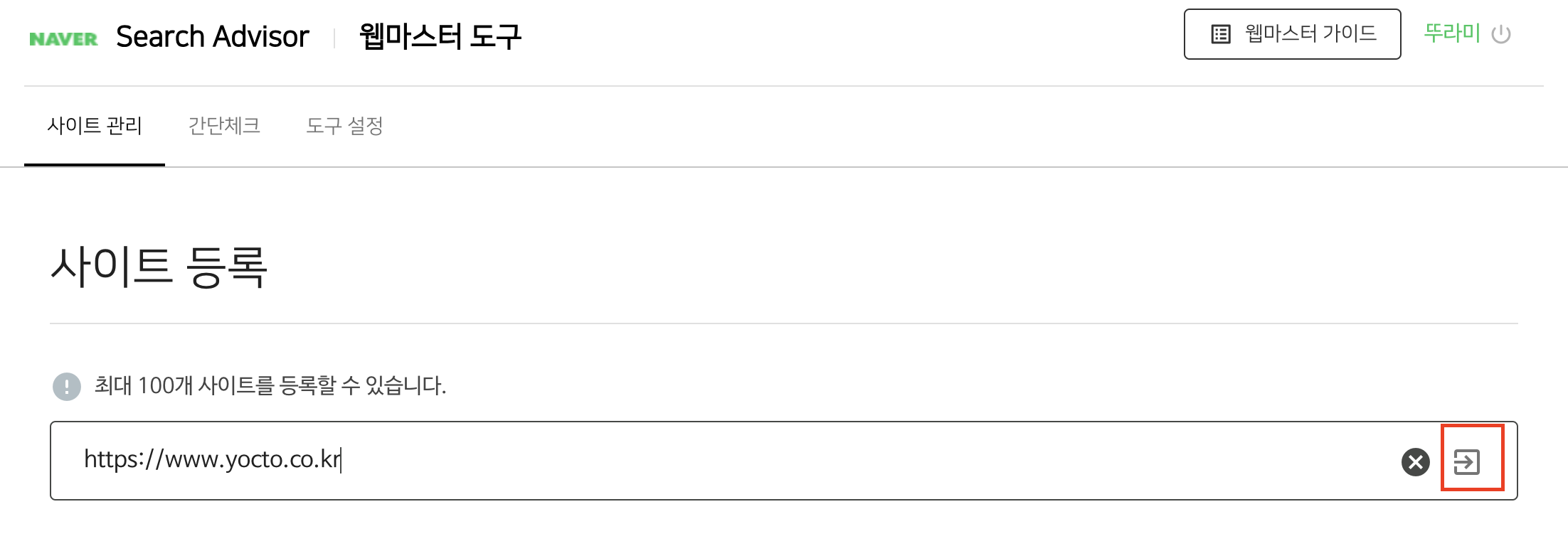 2. 등록할 사이트 주소를 입력하고 다음으로 넘어간다.
