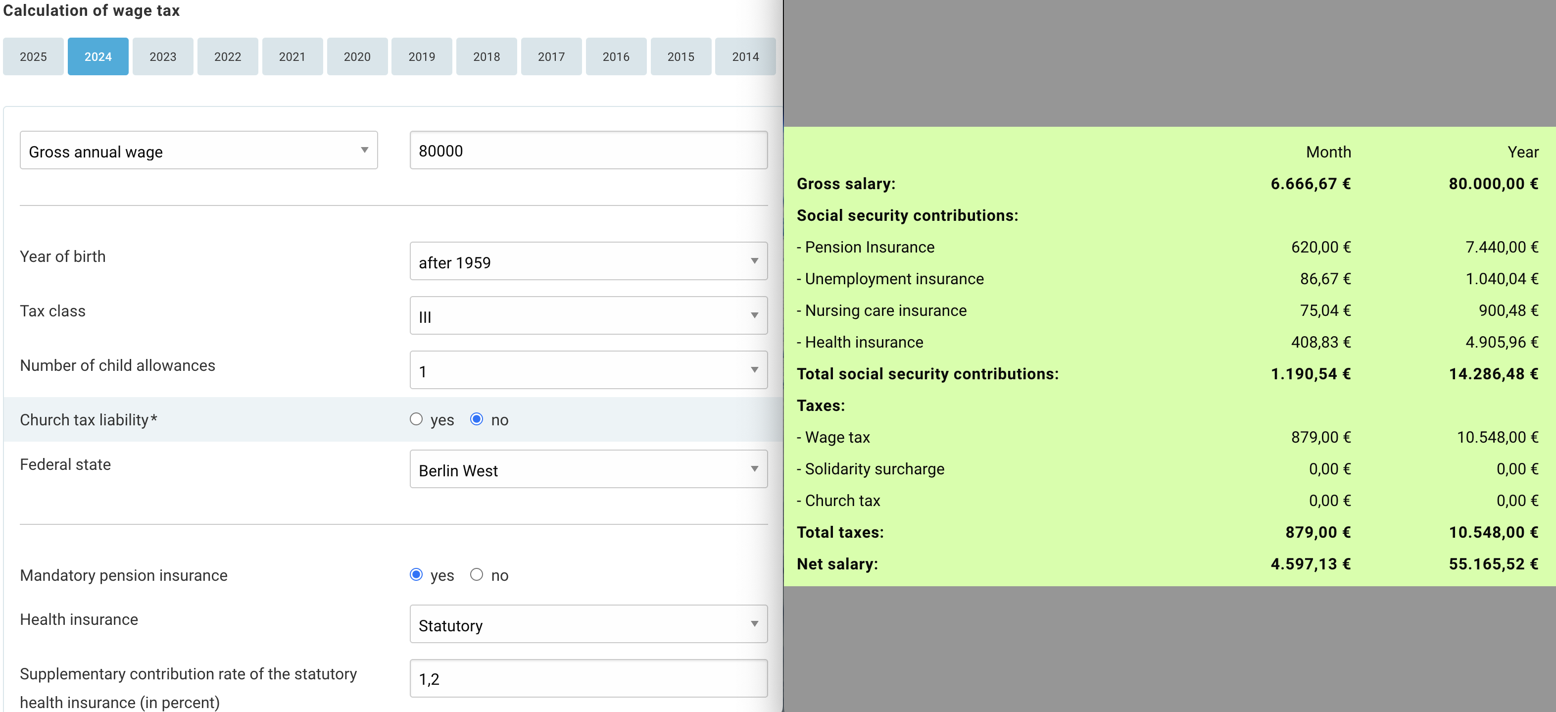 - 개인 연금: 총 소득의 18.6% 를 내야하며 고용주와 각각 9.3%씩 납부한다. 연금 최대치는 2024년에 연봉 90,600 유로, 2025년에는 연봉 연봉 96,600 유로로 매년 증가한다. 여기 예시에서는 연봉 80000유로 기준이기 때문에 개인 연금은 동일하다.
