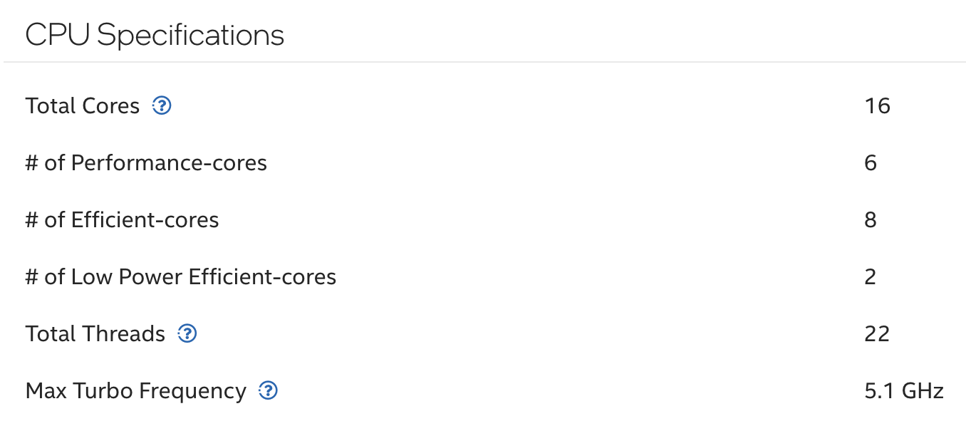 우선 Intel Core Ultra9 185H CPU 스펙을 간단히 보면 16 Core에 22 Threads를 지원한다. 중간에 보면 효율코어와 Low Power 코어도 있는것이 Intel Core의 특징이다. 개인적으로 이런 측면에서는 AMD가 낫지 않나 싶다. 가끔 이런 Efficient Core로 인해 빌드할 때 Segfalut가 나기도 한다.
