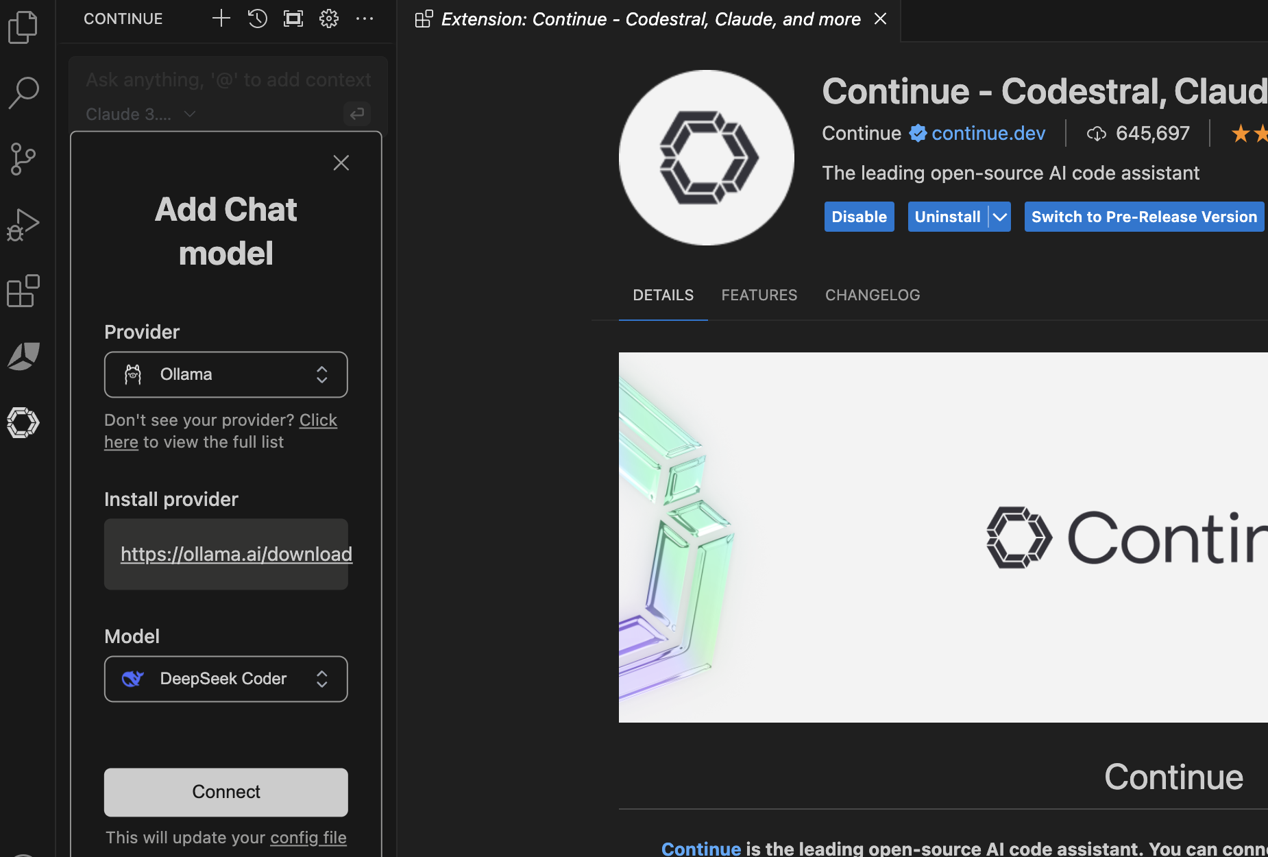 여기서 사용할 Extension은 Continue 이고 간단한 설치와 설정으로 DeepSeek를 사용할 수 있게 해준다. 이 Extension을 선택한 이유는 이전의 블로그 글에서 이야기한 local PC에서 쉽게 돌릴 수 있는 서비스인 ollama 를 지원하고 많은 개발자들이 사용, 업데이트도 잘되기 때문이다.