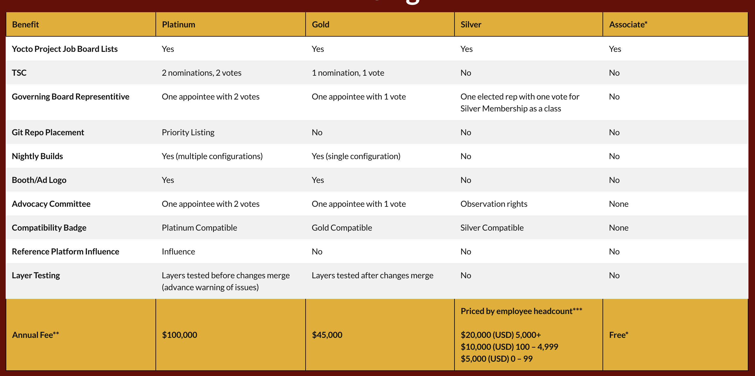 Yocto 멤버십에 가입하면 등급에 따라 다음과 같은 비용과 혜택이 주어진다. https://www.yoctoproject.org/join/ 링크에서 자세한 내용을 볼 수 있다. 가장 높은 등급은 투표권이 2장이 있고 Git 저장소 제공 및 CI 빌드도 지원한다.